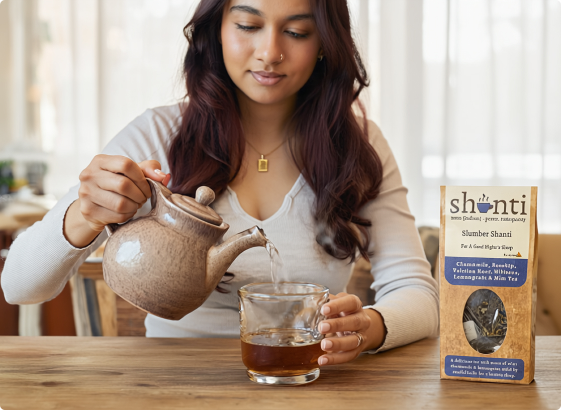 Slumber Shanti is a calming tea blend that helps you find a path to restful sleep, ease tension, and improve stress naturally. Crafted to be your gentle companion at the end of a long day, it supports a balanced sleep cycle, encourages relaxation, and can serve as a natural insomnia remedy so you wake feeling refreshed and renewed.