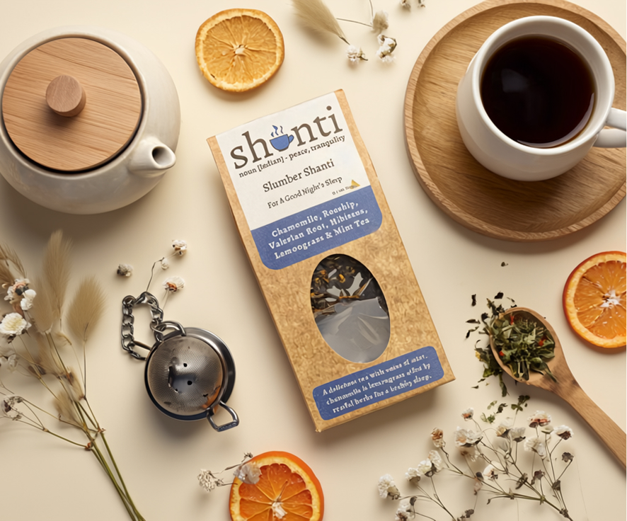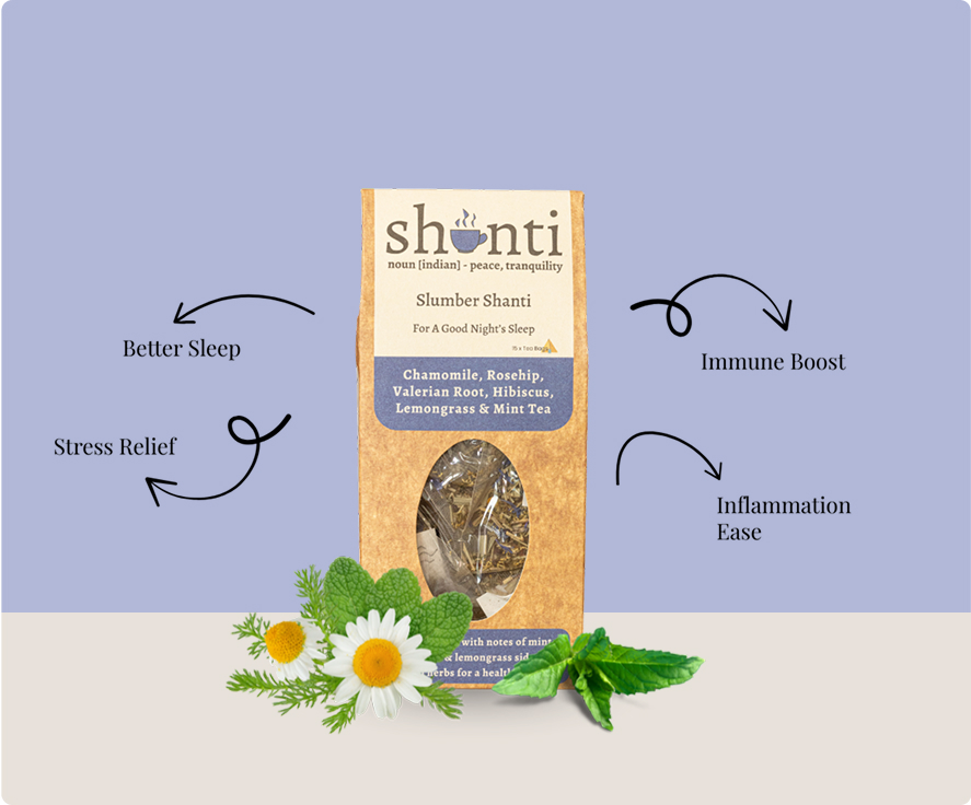 Slumber Shanti is a calming tea blend that helps you find a path to restful sleep, ease tension, and improve stress naturally. Crafted to be your gentle companion at the end of a long day, it supports a balanced sleep cycle, encourages relaxation, and can serve as a natural insomnia remedy so you wake feeling refreshed and renewed.